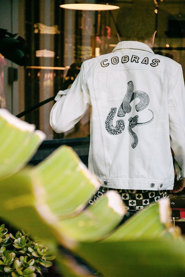 This denim jacket is designed with gang logos embroidered on the back and is available in black or white. Both are fashioned in lightweight washed denim and feature slight damage and repair details.